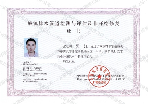 城鎮(zhèn)排水管道檢測與評估及非開挖修復證書